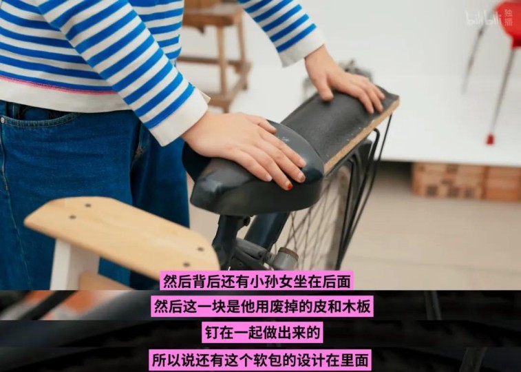 为了让小孙女坐得更舒适,宋老师在自行车的前后都专门设计了座椅。 后面的座椅甚至用了废掉的皮和木板钉在一起,做成软包的“沙发凳”。 细节反映出对小孙女的关爱。