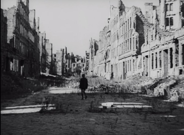 孩子经过被炸毁的教堂时,其中流出的管风琴乐曲将个体的悲剧浑然升华。他时而严肃地止步哭泣,时而又孩子气地嬉戏,甚至以玩具手枪进行了最具讽刺的戏谑,最后他攀爬到废墟的顶端,终于一跃而下-葬身战争的阴霾,与城市的废墟融为一体。影片最后一个镜头依旧颇具回味,和《罗马,不设防的城市》有着异曲同工之处,但不再有奔走的孩子们和远处的希望,一切都在颓废和荒芜中慢慢凝固和沉寂了。在这个摇升镜头中,一位妇人仰身背靠碎石堆,双臂低垂,酷似圣母玛丽亚怀抱基督尸体的图景。